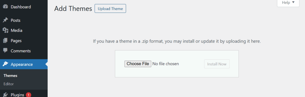 - Go to Appearance > Themes > Add New > Upload Theme.