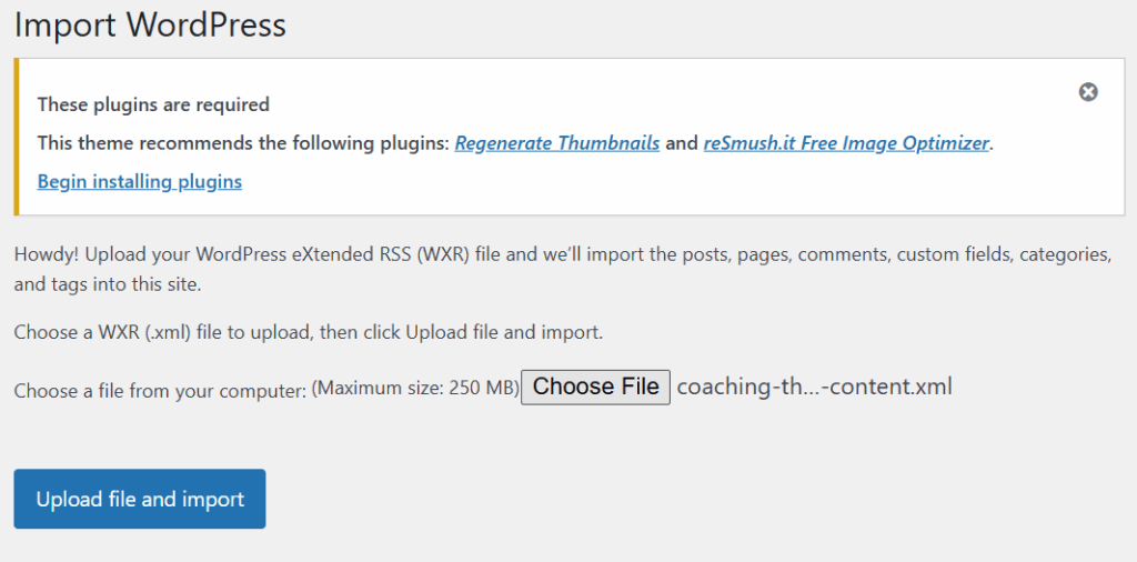 xml/demo-content.xmlfrom your theme folder. - Assign authors and check the “Download and import file attachments” box.