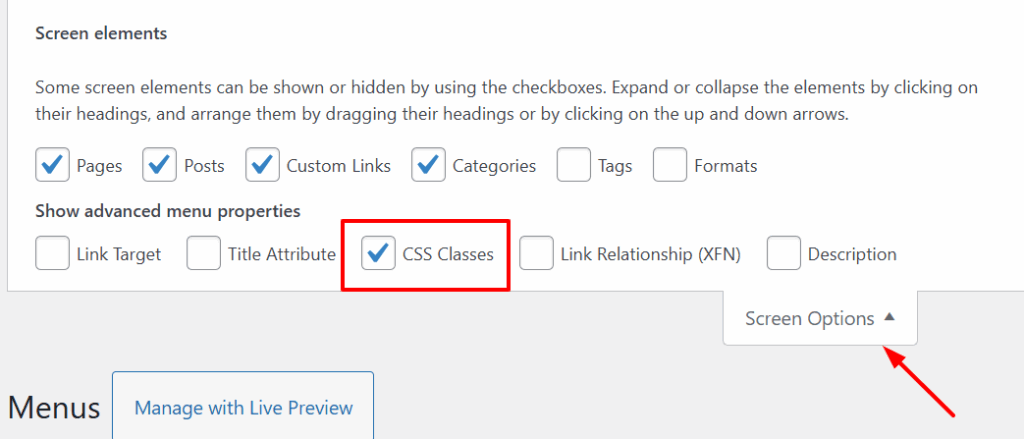- Click on Screen Options, then make sure CSS Classes is checked