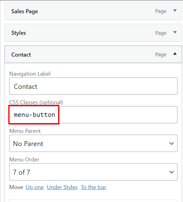 - Expand the menu item you want to turn into a button, then add the text menu-button into the CSS Classes field
