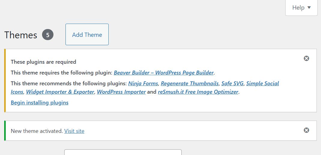 After activating the theme, a message will appear recommending some plugins. These include: