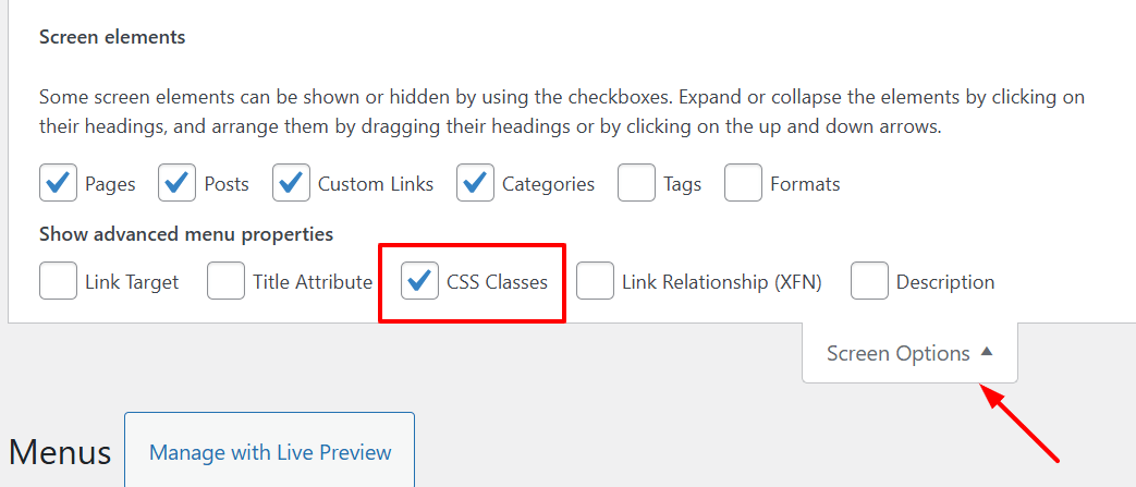 - Click on Screen Options, then make sure CSS Classes is checked