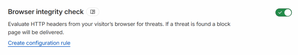 - Enable “Bot Fight Mode” and “Browser Integrity Check” under Security > Settings