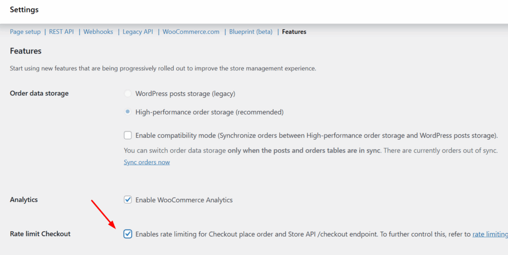- Enable WooCommerce Store API Rate‑Limiting – to limit excessive requests, go to WooCommerce -> Settings -> Advanced -> Features and enable “Rate limiting Checkout block and Store API”