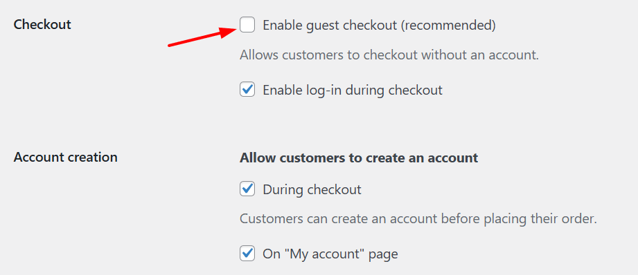 - Disable guest checkout (WooCommerce → Settings → Accounts & Privacy → uncheck “Allow customers to place orders without an account”)