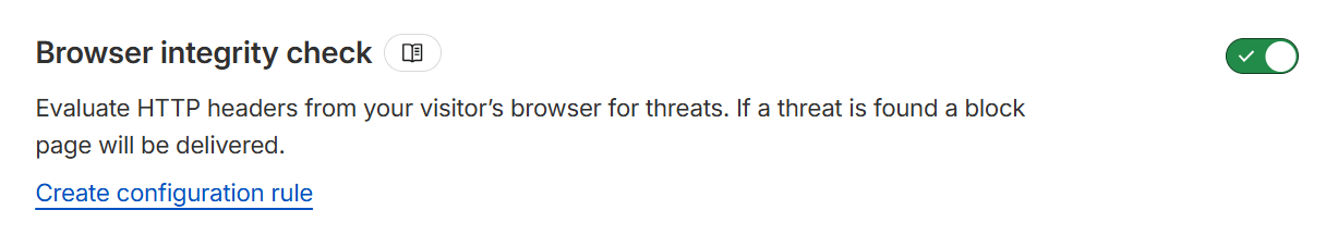 - Enable “Bot Fight Mode” and “Browser Integrity Check” under Security > Settings